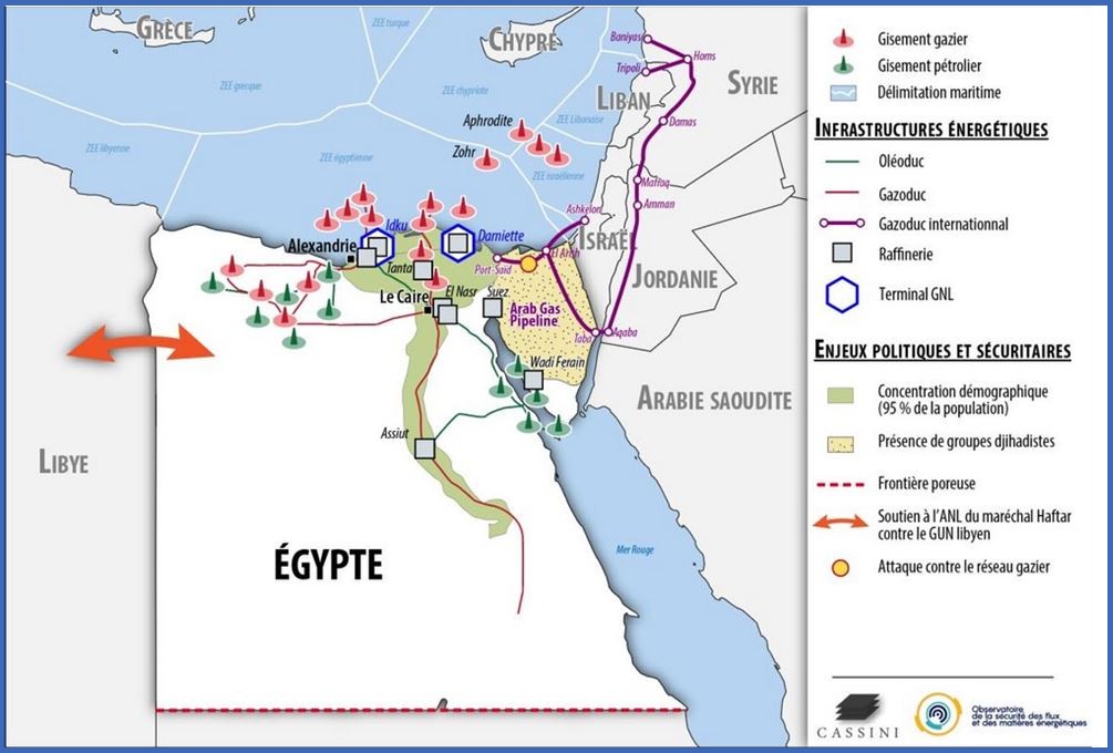 La découverte en Egypte du gisement « Zohr » en Méditerranée (Offshore) en 2015 a permis au pays de redevenir autosuffisant en gaz en 2018 et exportatrice nette de gaz en 2019. Le pays souhaite exploiter sa position géographique pour devenir une plateforme d’échanges de gaz. Sa proximité avec des consommateurs européens de GNL, comme l’Italie et l’Espagne, son accès aux marchés asiatiques via le canal de Suez, et ses infrastructures existantes de transport pourraient lui permettre de commercialiser l’exploitation des gisements de gaz découverts au large d’Israël et de Chypre. A défaut d’un gazoduc permettant leur exportation vers l’Europe, meme si son projet existe depuis plusieurs années « East Med » mais fait face à des conflits géopolitiques régionaux, leur production pourrait être acheminée vers l’Egypte qui dispose de deux usines de liquéfaction, avant d’être exportée sous forme de GNL