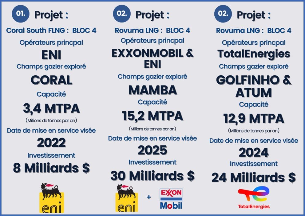 Le potentiel gazier est aussi très important en Afrique de l’Est, où entre 2010 et 2013, près de 5.000 milliards de M3 de gaz sont découverts au Mozambique. Elles correspondent aux neuvièmes plus grandes réserves gazières du monde, presque autant que le Nigeria, pouvant propulser le Mozambique dans le top cinq des exportateurs de GNL au niveau mondial. Celles-ci sont concentrées sur un petit nombre de champs gaziers en eaux profondes (2 000 mètres de profondeur) situés à cheval sur deux blocs, 1 et 4, dont l’exploitation devrait durer une trentaine d’années. Ces deux blocs sont opérés par la multinationale française Total (Bloc 1), l’italienne ENI et l’américaine ExxonMobil (bloc 4)Depuis l’éclatement du conflit RussoUkrainien, les projets de développement s’accélèrent de plus en plus.