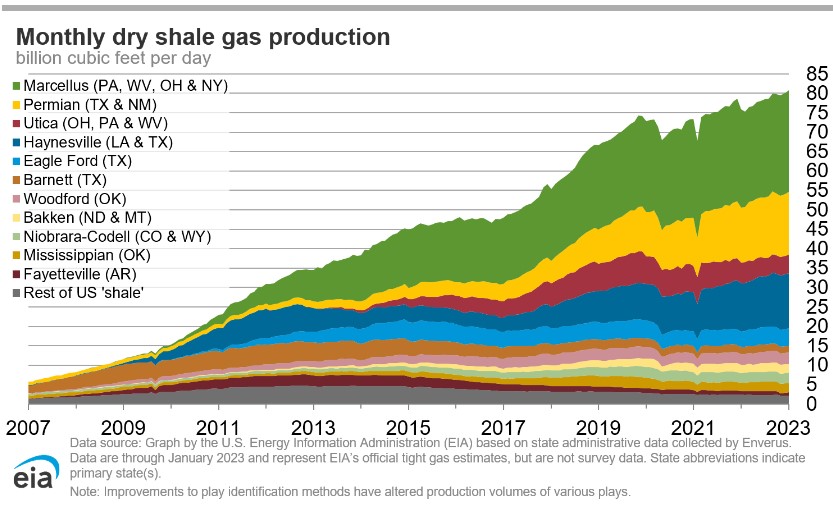 La production totale en gaz de schiste aux USA est actuellement de 80 milliards de pieds cubes par jour (Bcfd).