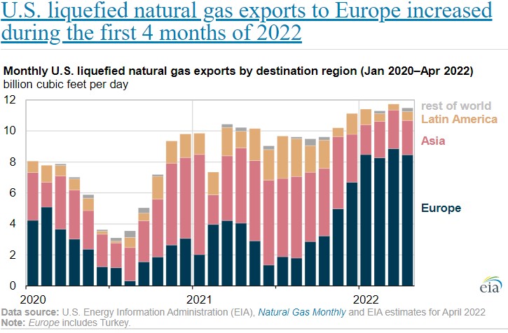 Au cours des six premiers mois de 2022, les États-Unis ont expédié 39 milliards de mètres cubes de GNL vers l’Europe. Ce chiffre est à comparer aux 29 milliards de mètres cubes expédiés pendant toute l’année 2021. Ce gaz américain est destiné à remplacer une partie du gaz que la Russie a coupé à l’Europe.