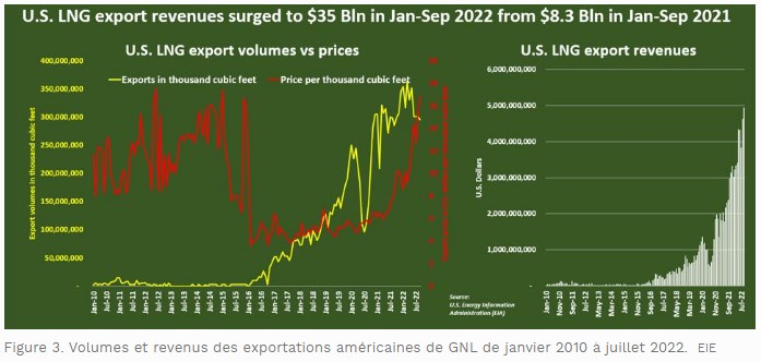 En juillet 2021, les prix à l’exportation du GNL ont décollé, atteignant 17 $/ MMBtu en juillet 2022. Les recettes d’exportation de GNL des États-Unis ont alors augmenté de manière exponentielle (partie droite de la figure 3). Les recettes sont passées de 8,3 milliards de dollars en janvier-septembre 2021 à 35 milliards de dollars en janvier-septembre 2022.