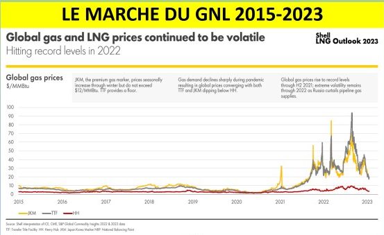 Le prix au comptant du GNL a baissé au cours des derniers mois et se situe actuellement à 19,50 $/MMBtu, mais entretemps il avait atteint brièvement un record de plus de 90$/MMBtu au cours de l’été 2022 au niveau du marché TTF, alors qu’au début de l’année 2021, lorsqu’ il était inférieur à 10 $/MBtu.