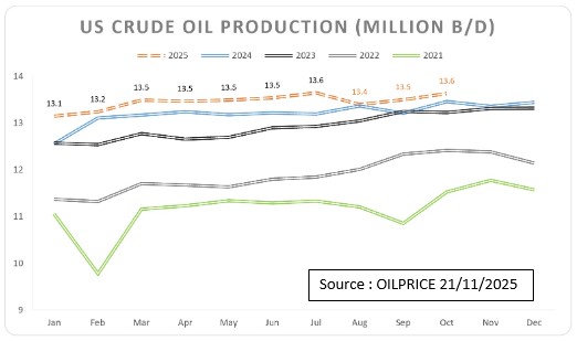 - La stratégie de l’OPEP+ semble quant à elle, focalisée sur une augmentation continue et modeste de sa production autour de 137000 barils/jour (Octobre 2025), correspondant à un véritable changement vers la défense de parts de marché plutôt qu’une augmentation du prix du baril ou au moins sa stabilisation sur une moyenne consensuelle entre ses membres.
